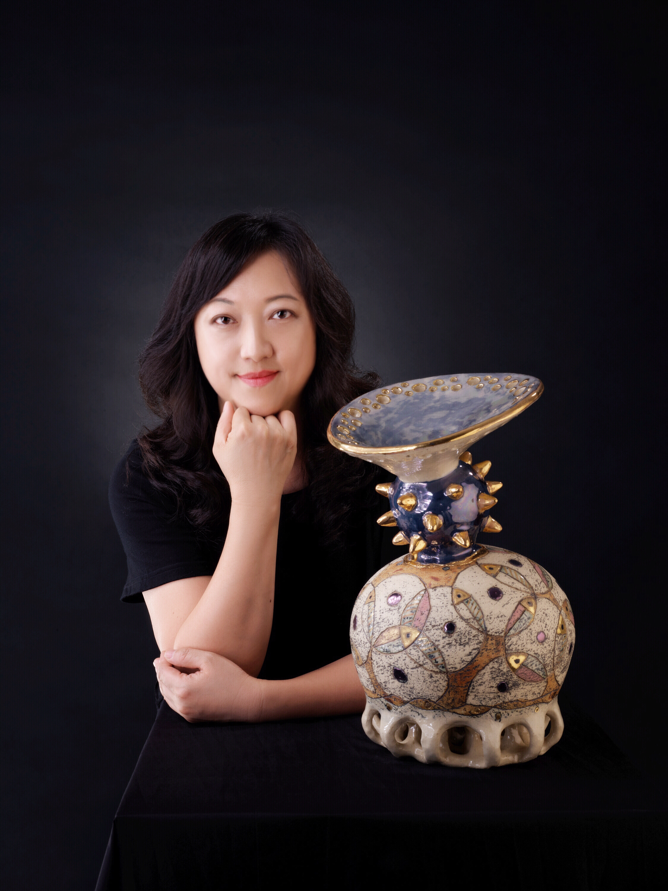 〈鋁箔包覆素燒坯體之燻燒研究〉,是黃玉英就讀研究所時的論文主題,她花了兩年時間找出適合燻燒的溫度,進一步實驗各種氧化物及水溶性化合物經過燻燒後的呈色,以使傳統的黑陶有更多的色彩變化;她亦不斷嘗試各種燻燒材料,尤其以卡點西德紙配合不同的器形設計圖案,創造黑陶與彩陶結合的特色,展現陶彩時尚、動感與亮麗的風貌。獨樹一幟的燻燒技法,彷彿在古老的旋律之中唱出嶄新的聲調,以有限的幾何線條蘊藏無限的生息。