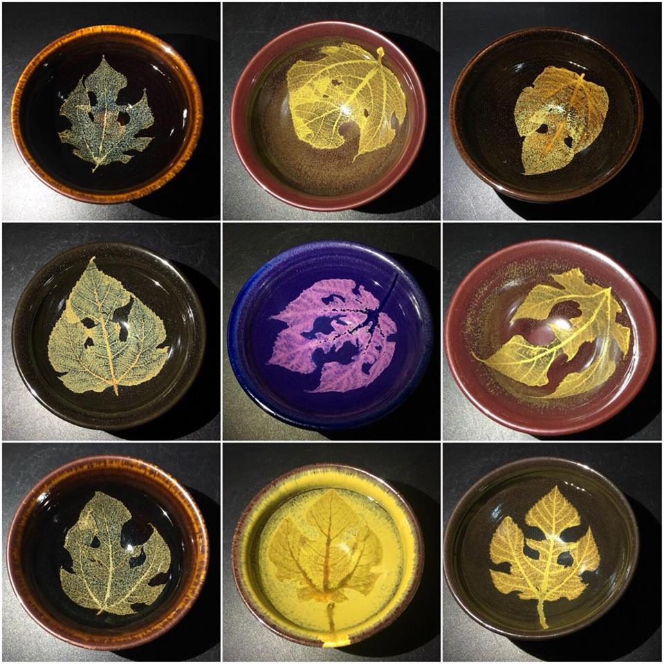 黃玉英近三年潛心實驗研發木葉天目系列作品,以天然的木葉燒熔於作品之中,歷經高溫的淬鍊,縱橫交錯的葉脈清晰朗現,盡展樸實飄逸的形貌,一如真實的樹葉,浮游於釉彩之洋,靈動綽約,誠為巧奪天工的珍品。尤有奇者,其獨門的「立葉」技法,克服地心引力,將樹葉垂直燒印於作品立面,更添姿態與氣韻,洵是一大創舉。