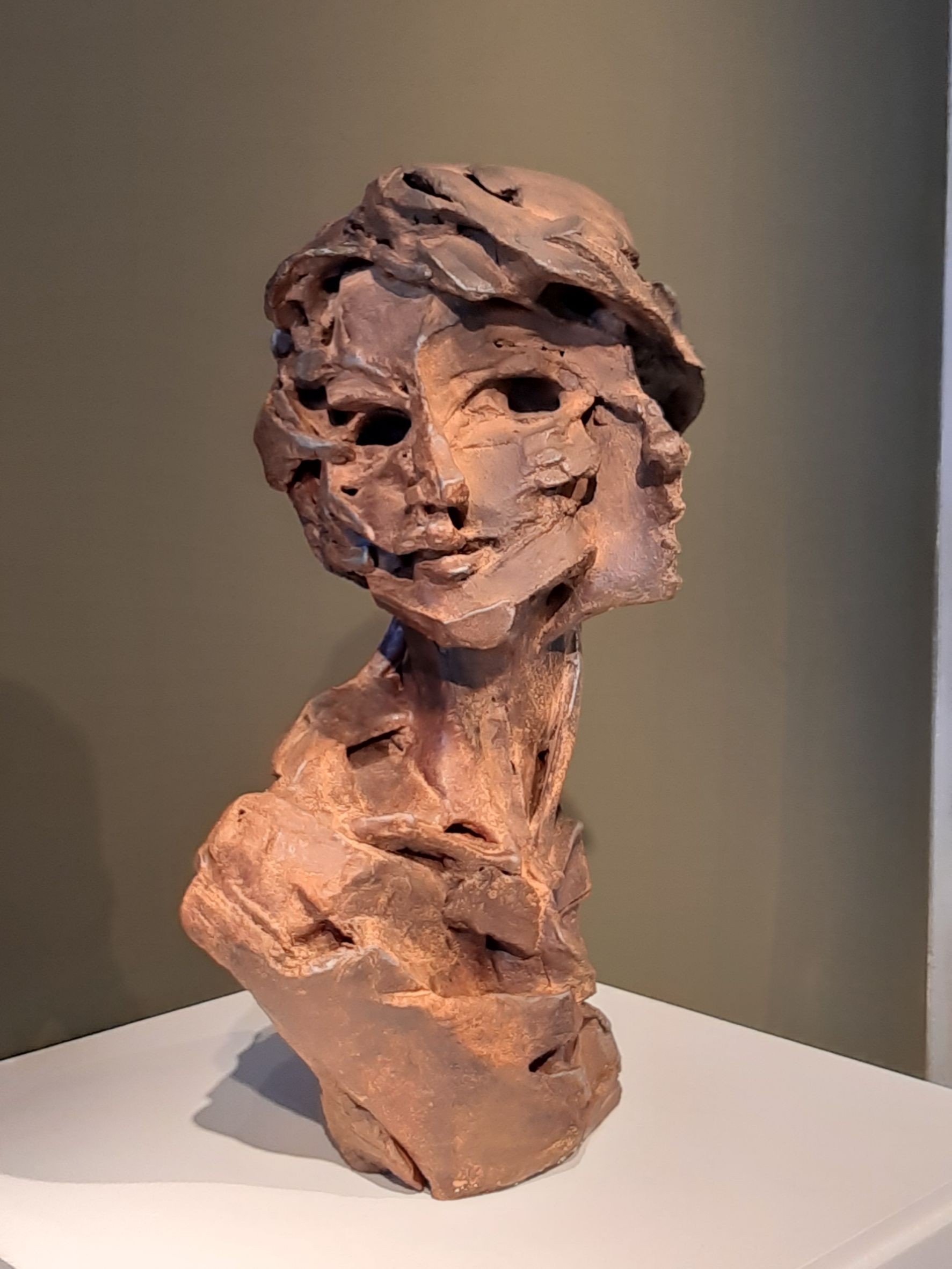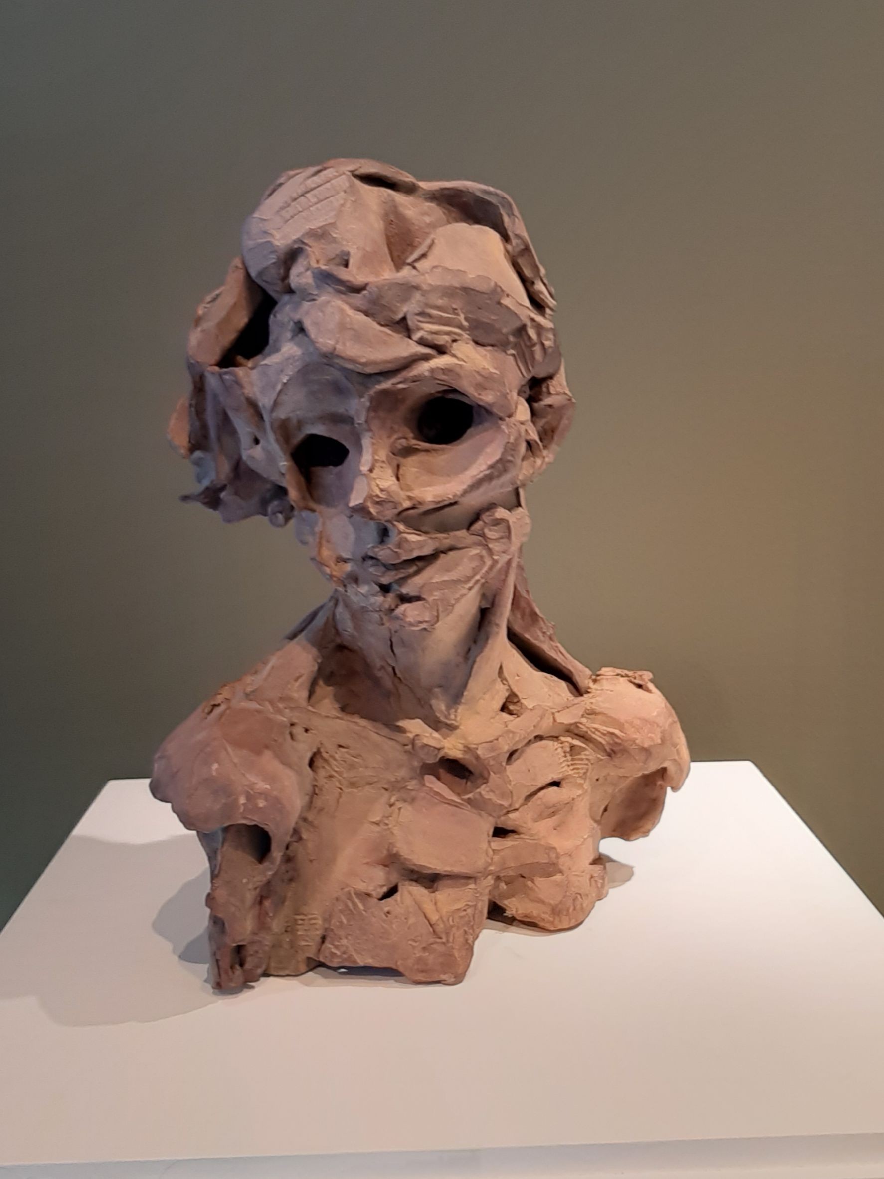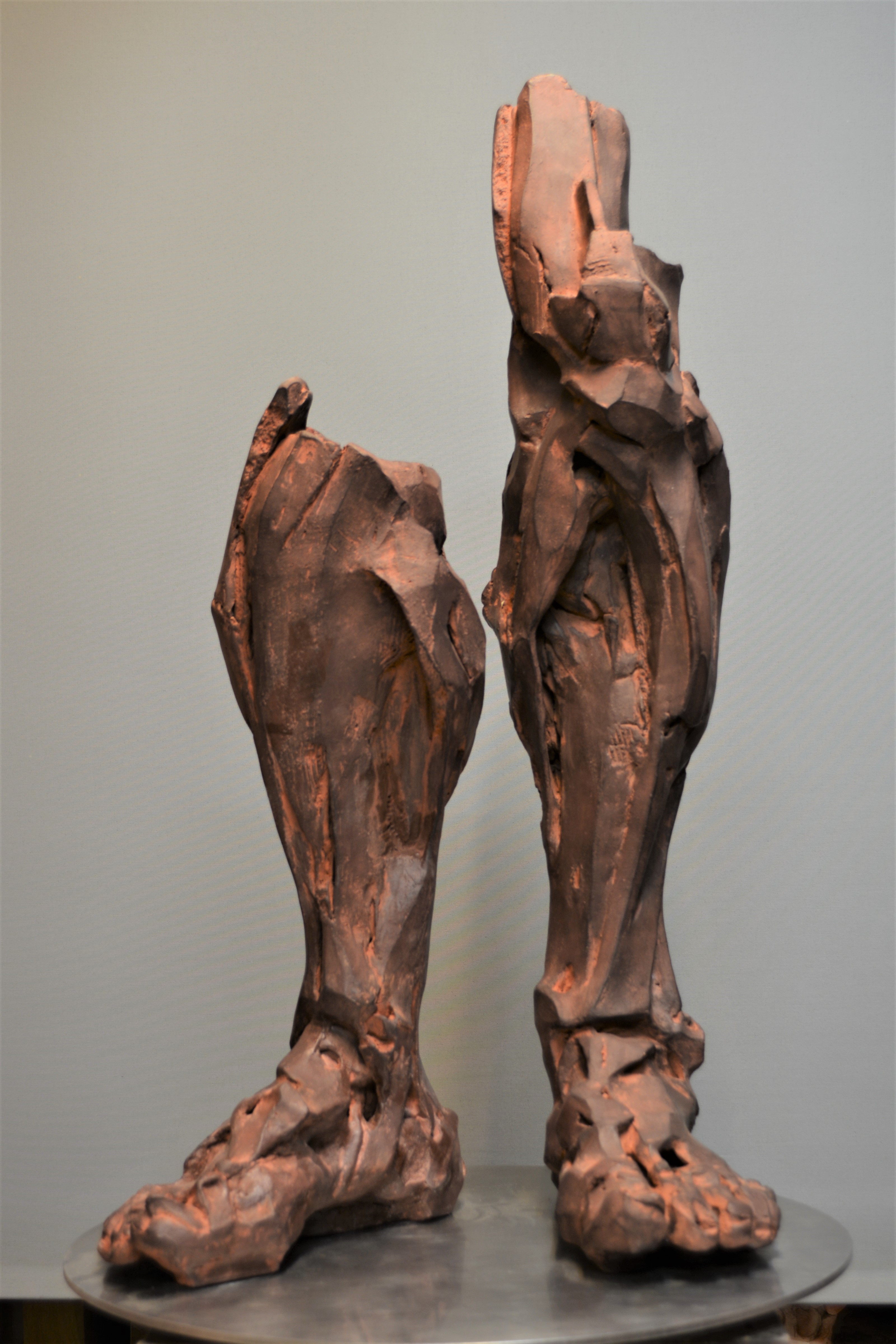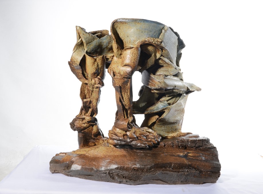 美國研究所期間,曾看到Peter Voulkos現場示範,那時產生最大印象不在於解構,在於建構,欣賞他的點線面大膽排列,受他影響,道教似是而非及虛實相映的觀念,開始進入腦海裡. 在Anderson Ranch Arts Center 駐村時,父親拿著刀子做鞋子的模樣,一直盤據在心頭,為了解決困擾,在 Archie Bray Foundation 駐村時,開始回憶小時,皮革經刀子切割,碎片排列成的樣子,似乎是個有趣的人藏在裡頭,於是便開啟片狀堆疊的技法,當時做了腳跟人的主題.