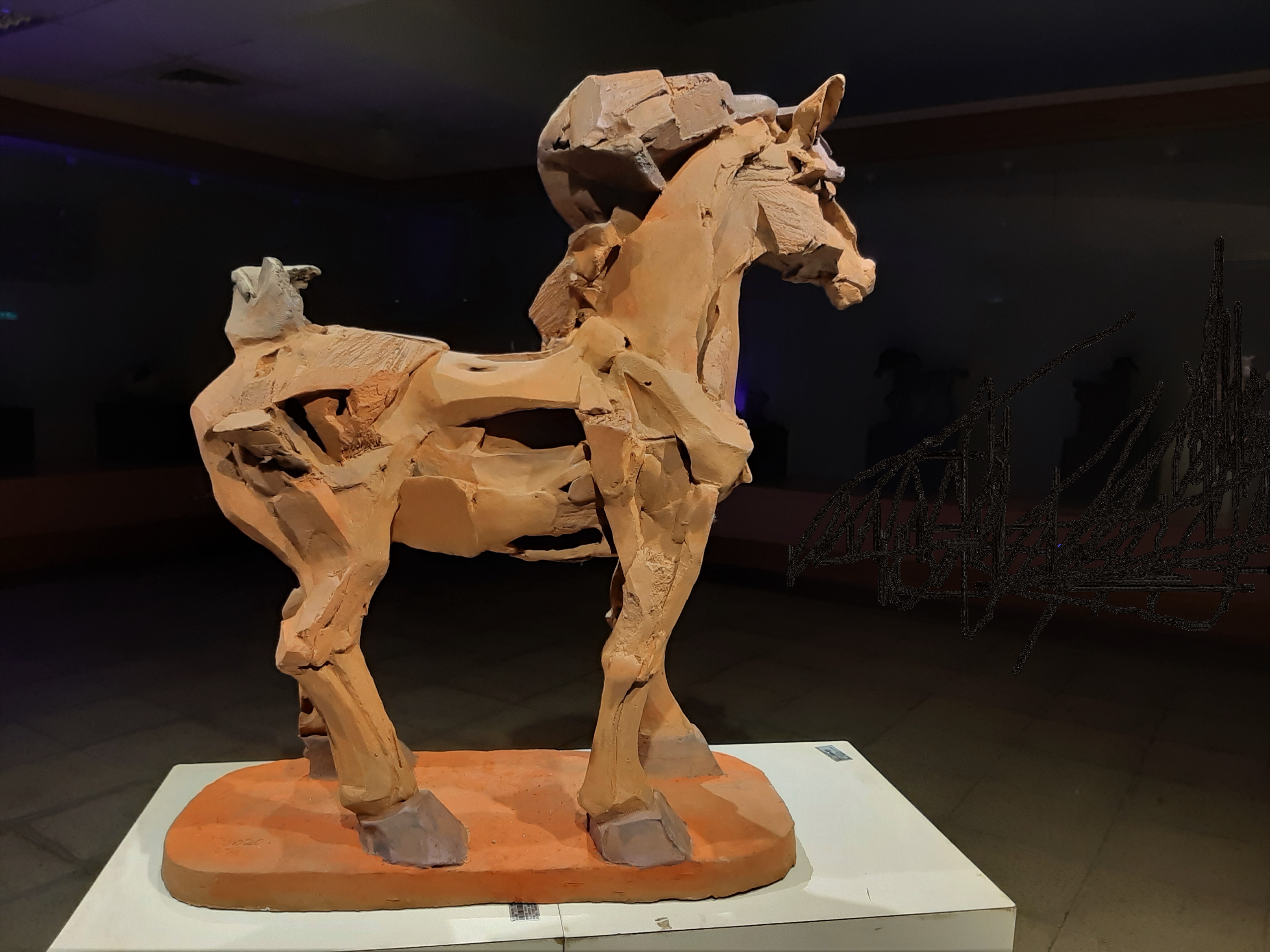 馬是受美國研究所同學的影響,有次到她的工作室,驚訝她在學習秦漢時的馬,當時非常羞愧,東方人居然不知道東方的優點. 回台灣用堆疊法做馬屢次失敗,於是好幾年放空,直到鶯歌高職同事林妙芳老師提醒我-書法是線條的雄辯.明白底蘊太淺,於是從國畫馬/書法開始學習,並開始看相關文章,慢慢發現古代也有的空間雕塑概念,計白當黑/密不通風/寬可跑馬,這些慢慢影響點線面的組合,以前過多線干擾視覺的缺點慢慢消失,堆疊成型中產生的洞,不再只是空無,部分變成賞味點.