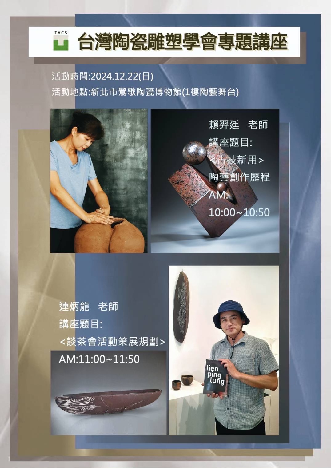 台灣陶瓷雕塑學會邀請專業老師分享陶瓷雕塑的技術與藝術發展,探討傳統與現代陶藝的創作過程及趨勢,提供學術交流平台,促進陶瓷藝術愛好者與專業人士的深入交流與合作。歡迎各界人士踴躍報名參加,與我們一同探索陶瓷藝術的無限可能。