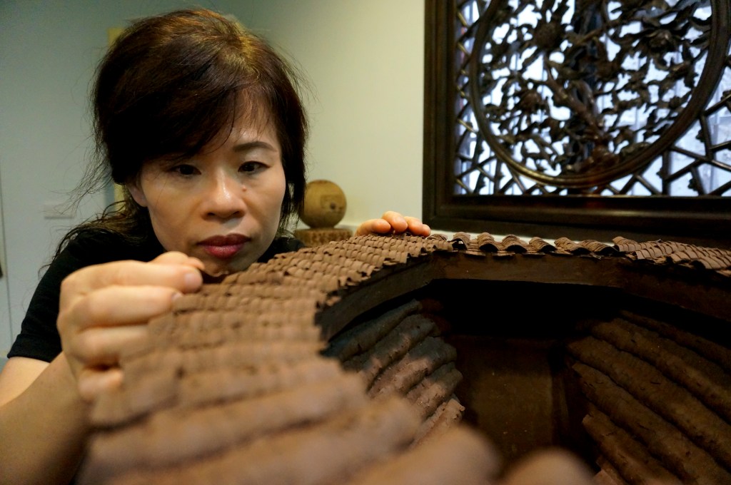許明香的陶藝創作時常融入臺灣的人、事、地、物,與個人生命經驗和記憶、家族情感緊密相連,用藝術的力量展現人文關懷。由於對台灣古厝有深厚情感,所以接觸到台灣傳統建築的發展歷史,尤其提及當時人們為了軍事需要所建造的城門,以及當時的建築史,都讓我產生極大的興趣,一直想深入的了解與探究。
